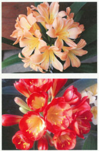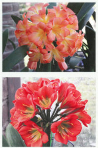 This is the best-known and most impressive of the species. They flower in spring and have the largest flowers, with a stunning range of colours and variations. Clivia colours have been allocated categories like, besides the gorgeous variations of the native orange and red, also yellow, pink, pastels and peach. Colour combinations led to descriptions like bicolours, picotees, watercolours, ghosts, greenthroats, versicolours and many more.